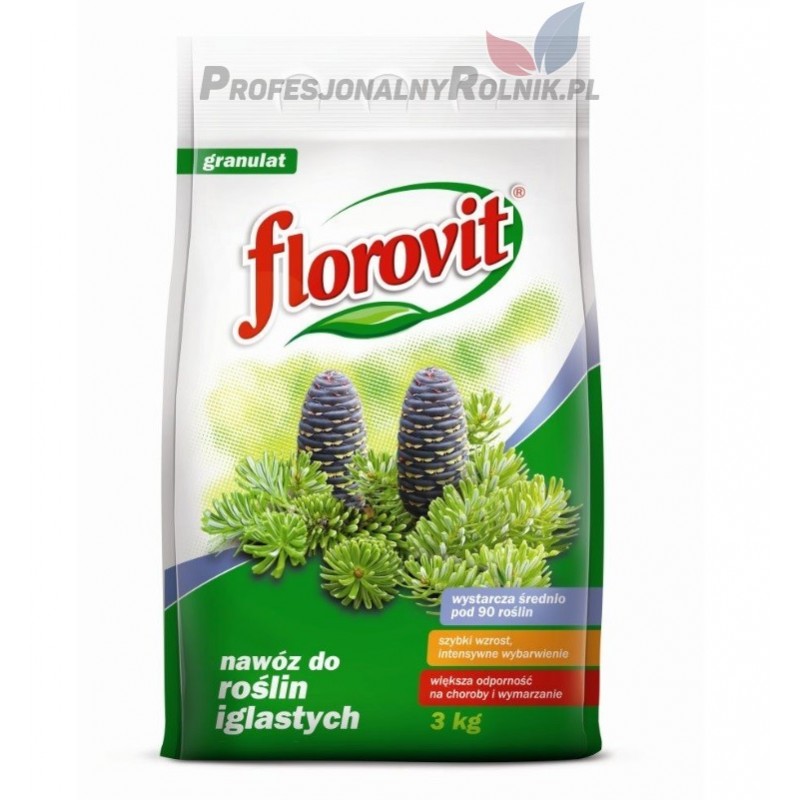 Florovit do roślin iglastych zawiera składniki mineralne w ilościach odpowiadających zapotrzebowaniu ozdobnych roślin iglastych takich jak cis, modrzew, cyprys, świerk, sosna, jodła i inne.
